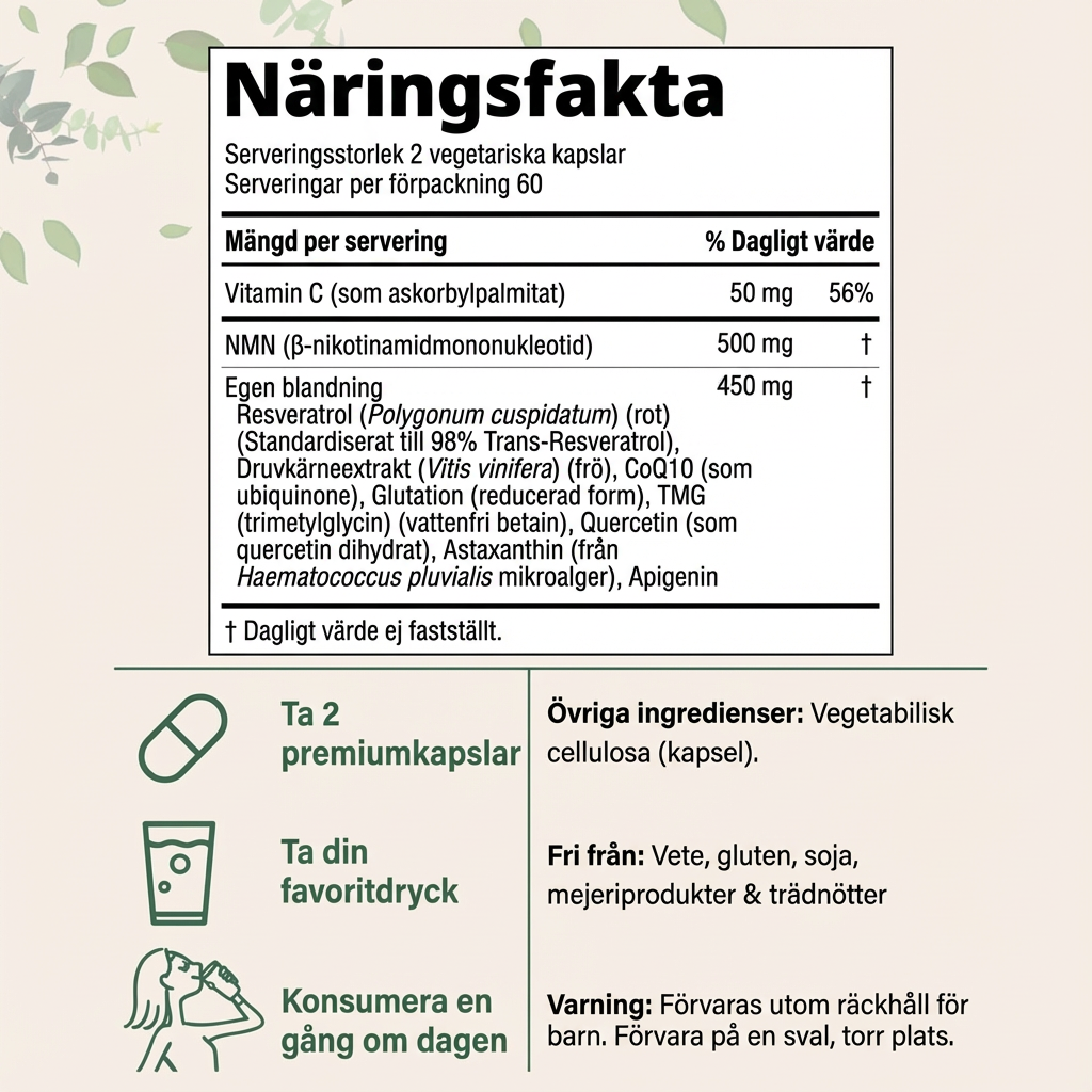 NMN hjälper kroppen att skapa NAD, som cellerna behöver för att producera energi. När NAD-nivåerna sjunker med åldern kan kroppen kännas tröttare och mindre fokuserad – NMN stödjer att den energin byggs upp igen.